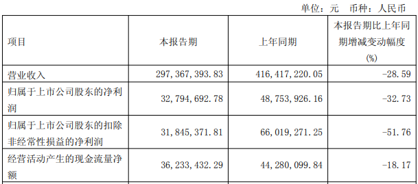 2025年第一季度,秦安股份营业收入为2.97亿元,同比下降28.59%;归属于上市公司股东的净利润0.33亿元,同比下降32.73%;归属于上市公司股东的扣除非经常性损益的净利润0.32亿元,同比下降51.76%;经营活动产生的现金流量净额0.36亿元,同比下降18.17%。