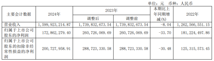 2024年,秦安股份营业收入为16.00亿元,同比下降8.04%;归属于上市公司股东的净利润1.73亿元,同比下降33.70%;归属于上市公司股东的扣除非经常性损益的净利润2.01亿元,同比下降30.48%;经营活动产生的现金流量净额4.06亿元,同比增长32.10%。