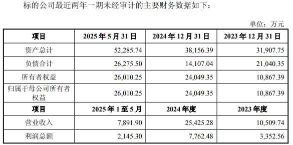 2023年、2024年、2025年1至5月,标的公司营业收入分别为10,509.74万元、25,425.28万元、7,891.90万元,净利润/归属于母公司所有者的净利润分别为2,992.45万元、6,710.23万元、1,949.70万元。